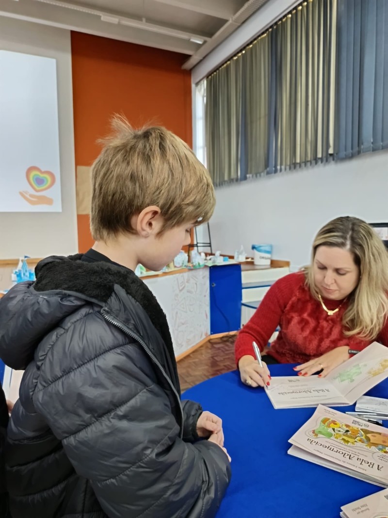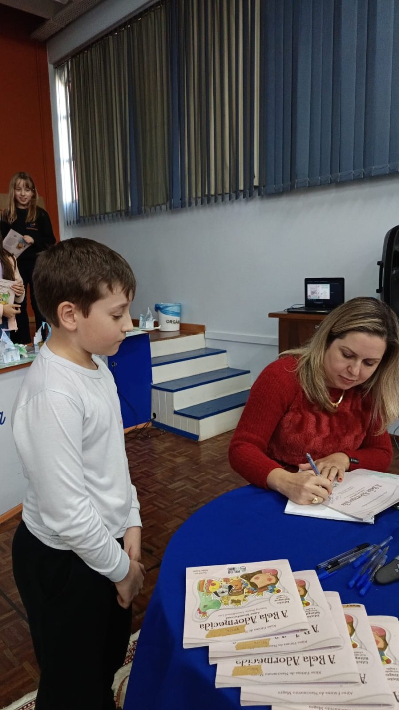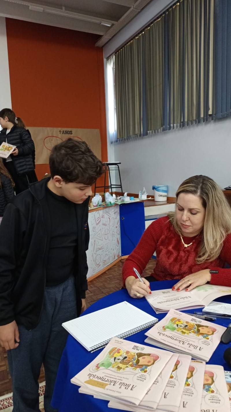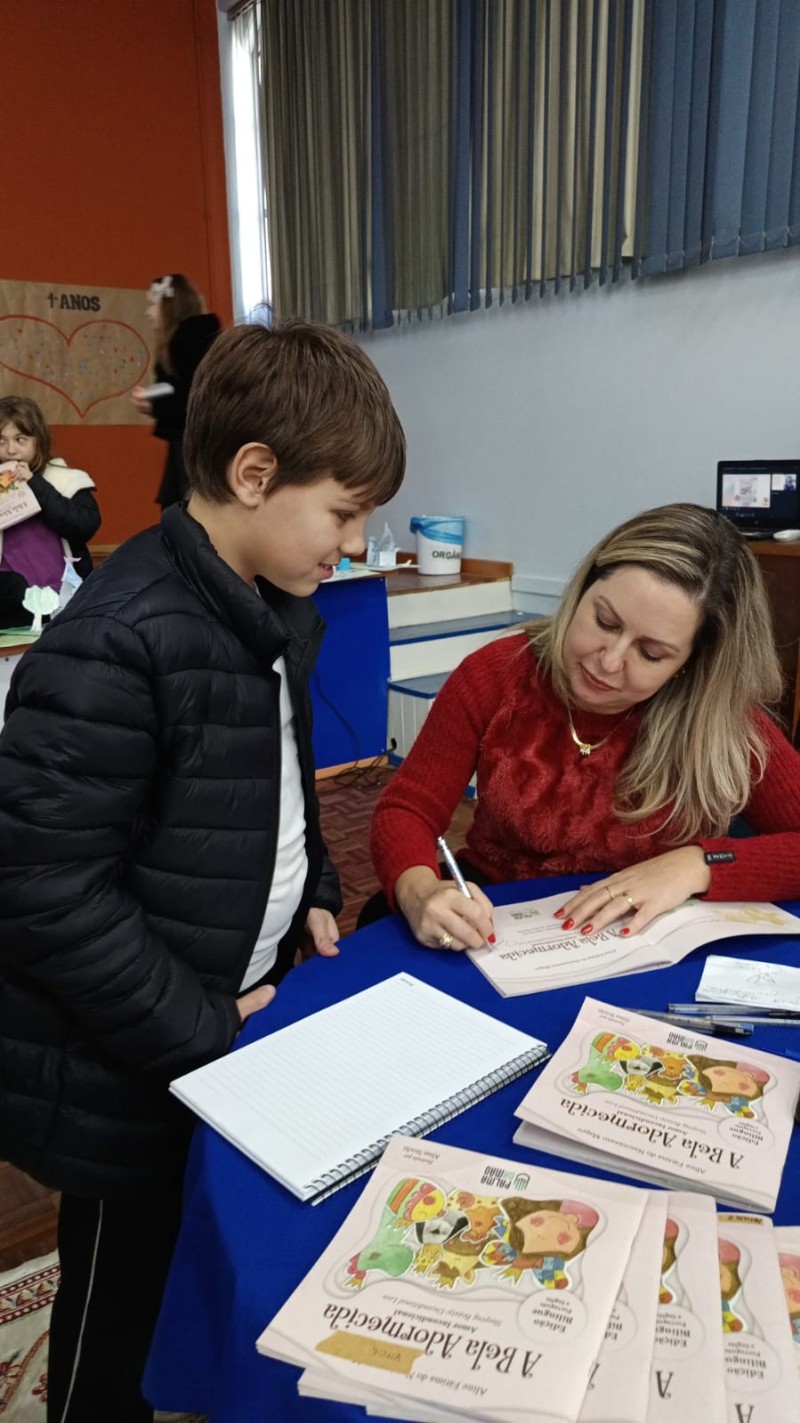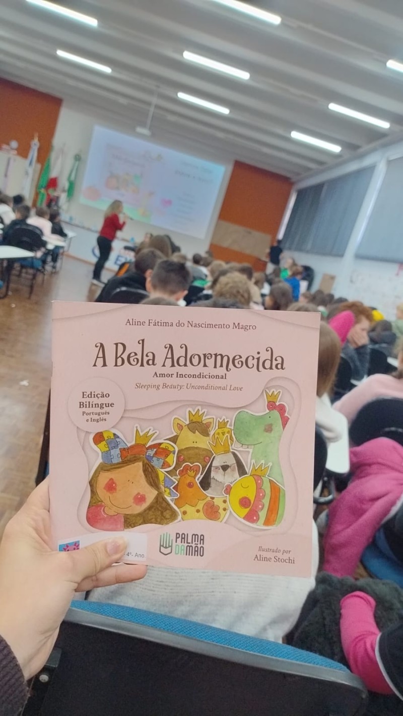 Em 13.06.25 ocorreu a 4ª fase do projeto da leitura. Sobre a obra A Bela Adormecida: Amor Incondicional (edição bilíngue – Português/Inglês), com a presença da autora Aline Fátima do Nascimento Magro. Natural de Santa Rosa/RS, ela reside em Chapecó/SC com a família há quinze anos, é servidora pública e doutora em Serviço Social. Aline transformou vivências e experiências da família numa obra de literatura infantil com viés do transtorno de espectro autista (TEA), fruto do aprendizado por meio do amor incondicional. A obra é literalmente o livro da sua vida e sempre terá um lugar especial no meu coração, pois teve inspiração na Natália, sua segunda filha, que foi diagnosticada com TEA aos três anos, sendo carregado por uma poderosa mensagem de amor que toca o coração de pequenos aos adultos. Fase essa que houve, abertura, acolhimento às professoras, crianças, e principalmente a escritora Aline, pela Coordenação Pedagógica Ivanir Lopes. Depois o diálogo da escritora com as crianças. Momento de autógrafos e para a fotografia da turma com a autora, e por fim, atividade dinâmica, onde cada criança deixou sua marca, representando que cada um é diferente, respeitando a diversidade, num coração cheio de digitais, e retomando o viés da obra, o amor incondicional!