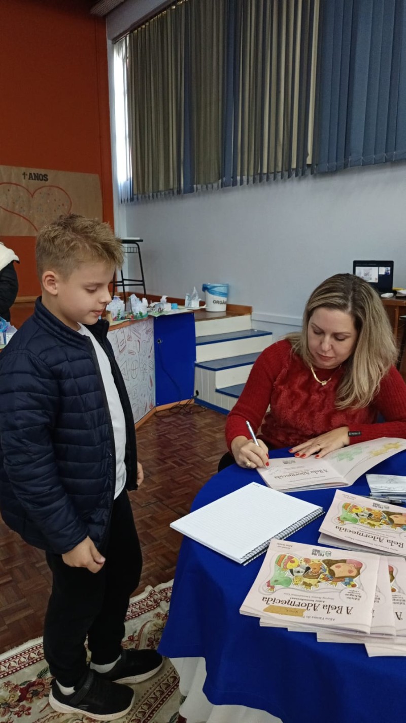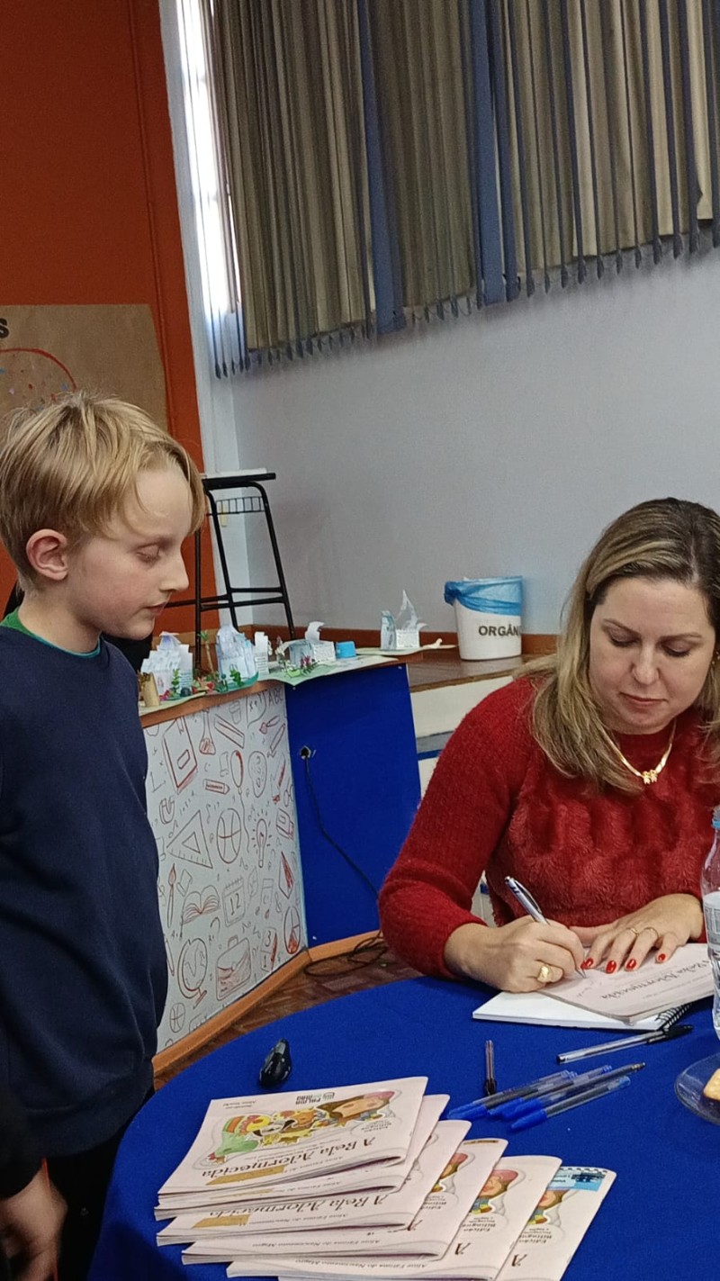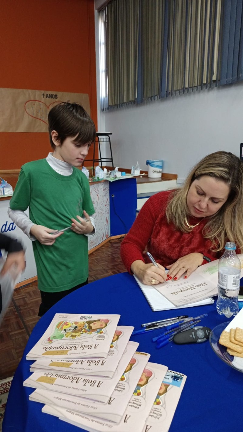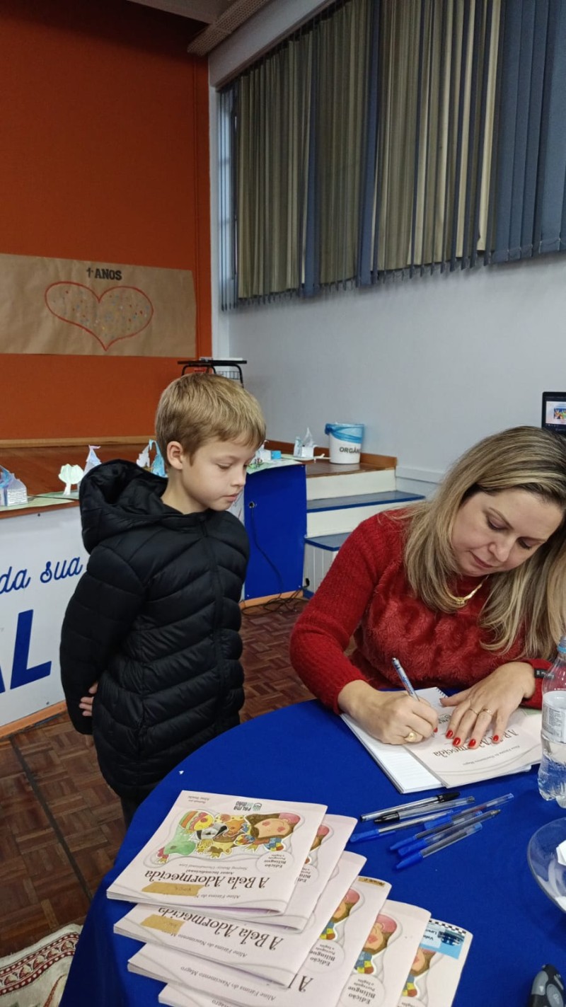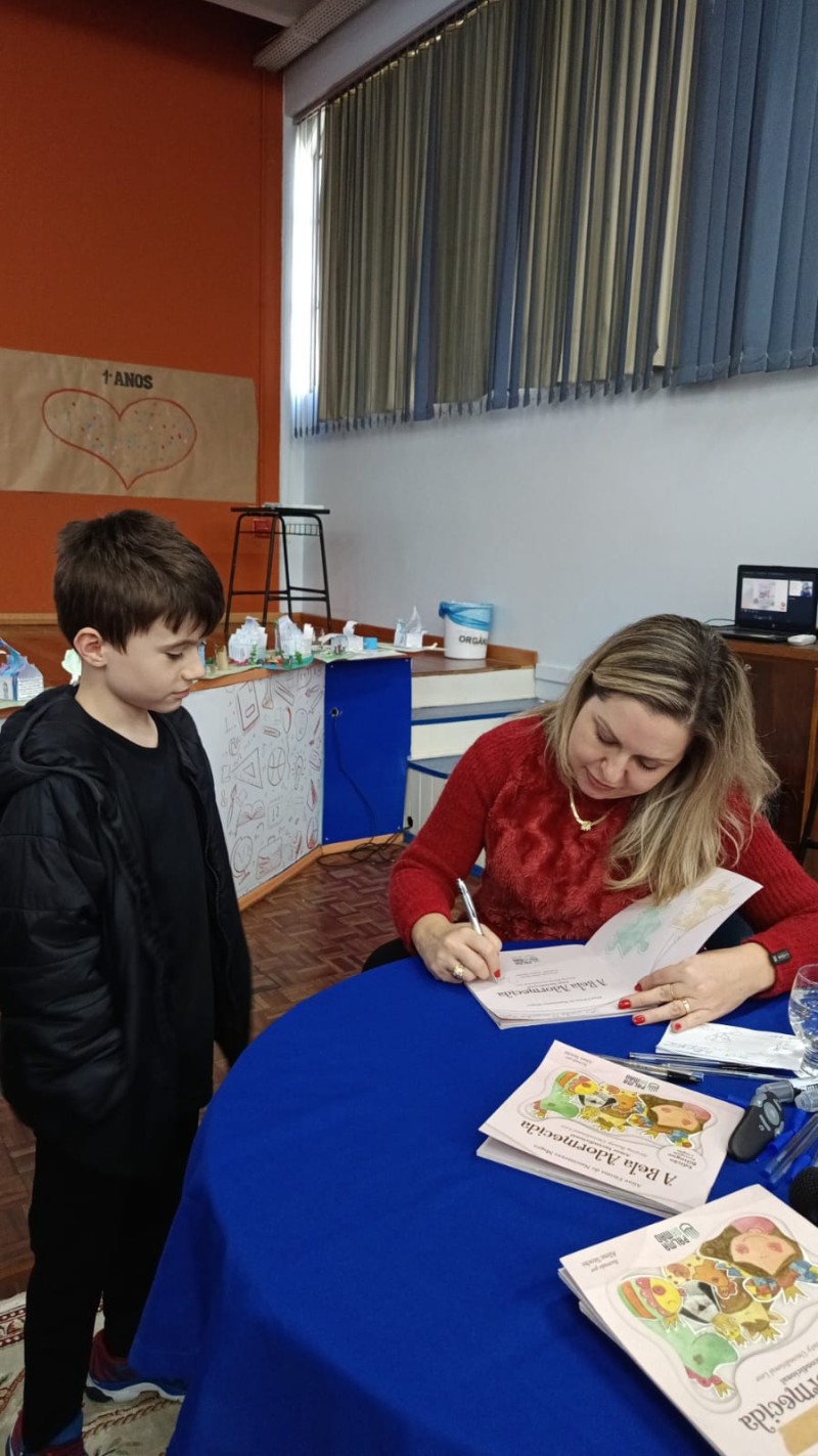 Em 13.06.25 ocorreu a 4ª fase do projeto da leitura. Sobre a obra A Bela Adormecida: Amor Incondicional (edição bilíngue – Português/Inglês), com a presença da autora Aline Fátima do Nascimento Magro. Natural de Santa Rosa/RS, ela reside em Chapecó/SC com a família há quinze anos, é servidora pública e doutora em Serviço Social. Aline transformou vivências e experiências da família numa obra de literatura infantil com viés do transtorno de espectro autista (TEA), fruto do aprendizado por meio do amor incondicional. A obra é literalmente o livro da sua vida e sempre terá um lugar especial no meu coração, pois teve inspiração na Natália, sua segunda filha, que foi diagnosticada com TEA aos três anos, sendo carregado por uma poderosa mensagem de amor que toca o coração de pequenos aos adultos. Fase essa que houve, abertura, acolhimento às professoras, crianças, e principalmente a escritora Aline, pela Coordenação Pedagógica Ivanir Lopes. Depois o diálogo da escritora com as crianças. Momento de autógrafos e para a fotografia da turma com a autora, e por fim, atividade dinâmica, onde cada criança deixou sua marca, representando que cada um é diferente, respeitando a diversidade, num coração cheio de digitais, e retomando o viés da obra, o amor incondicional!