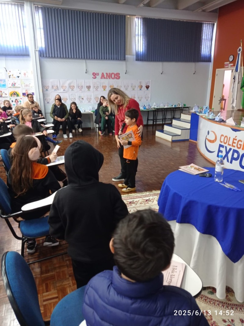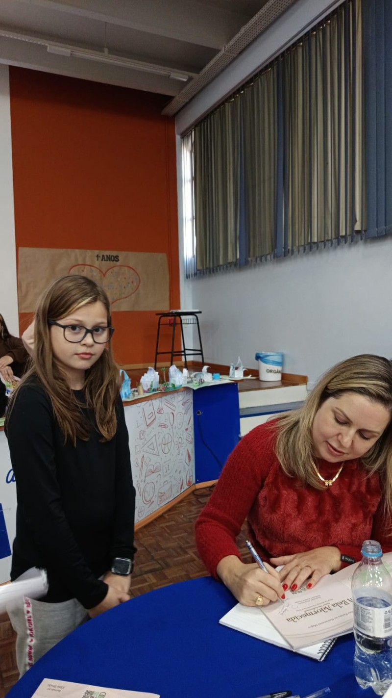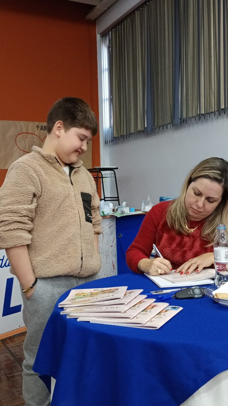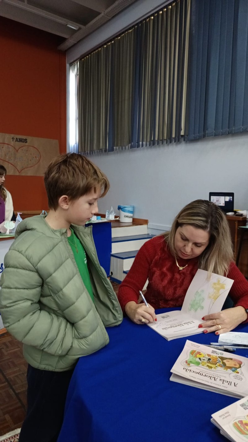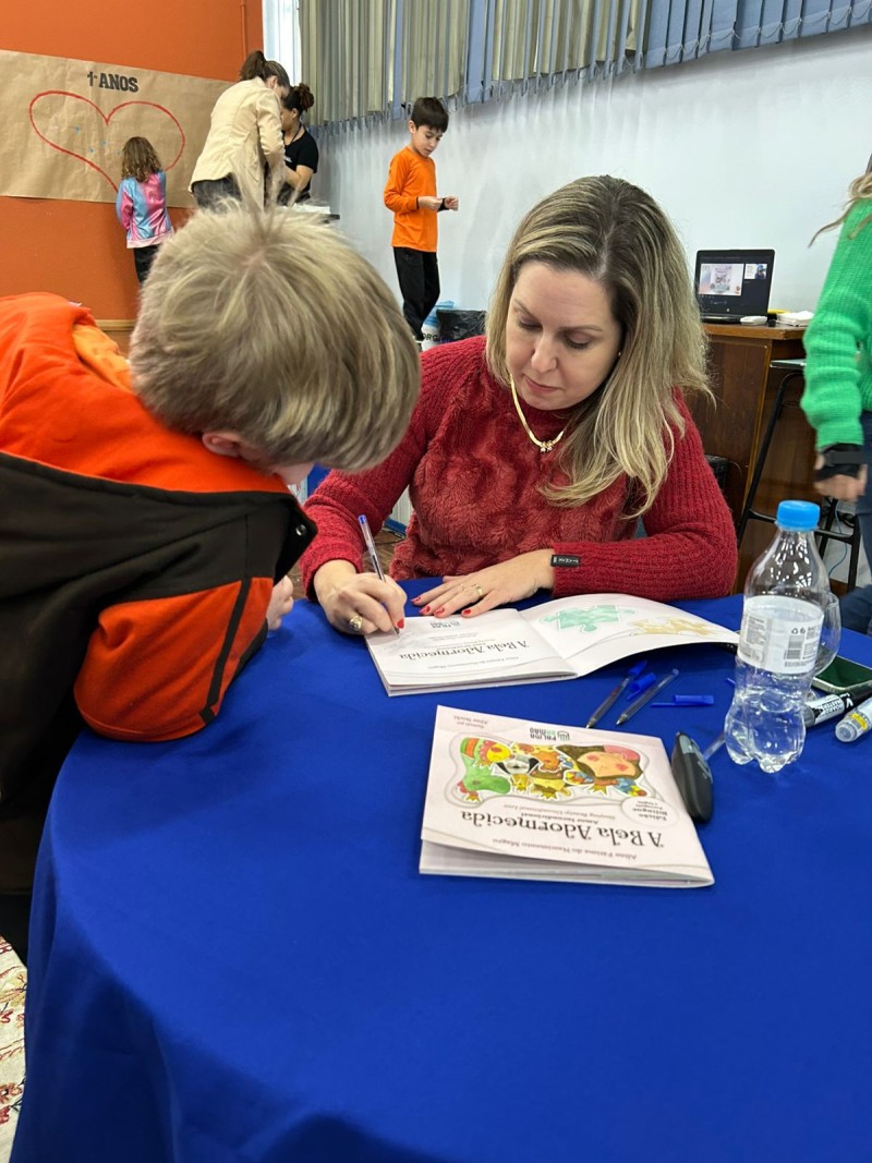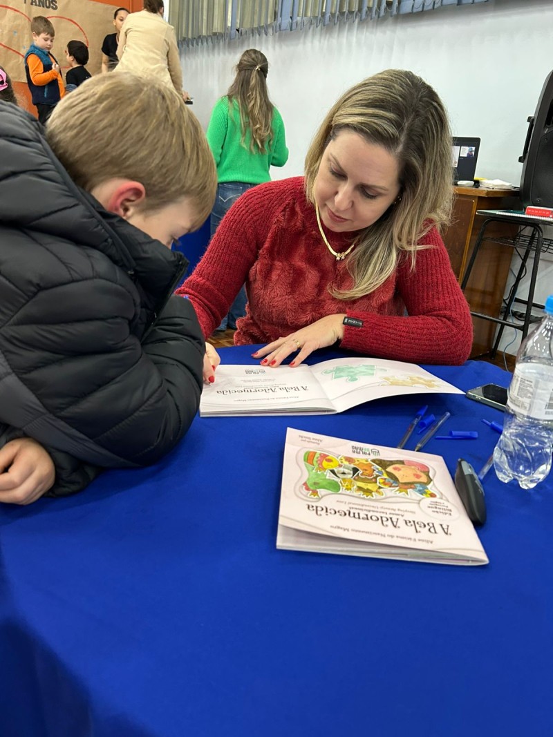 Em 13.06.25 ocorreu a 4ª fase do projeto da leitura. Sobre a obra A Bela Adormecida: Amor Incondicional (edição bilíngue – Português/Inglês), com a presença da autora Aline Fátima do Nascimento Magro. Natural de Santa Rosa/RS, ela reside em Chapecó/SC com a família há quinze anos, é servidora pública e doutora em Serviço Social. Aline transformou vivências e experiências da família numa obra de literatura infantil com viés do transtorno de espectro autista (TEA), fruto do aprendizado por meio do amor incondicional. A obra é literalmente o livro da sua vida e sempre terá um lugar especial no meu coração, pois teve inspiração na Natália, sua segunda filha, que foi diagnosticada com TEA aos três anos, sendo carregado por uma poderosa mensagem de amor que toca o coração de pequenos aos adultos. Fase essa que houve, abertura, acolhimento às professoras, crianças, e principalmente a escritora Aline, pela Coordenação Pedagógica Ivanir Lopes. Depois o diálogo da escritora com as crianças. Momento de autógrafos e para a fotografia da turma com a autora, e por fim, atividade dinâmica, onde cada criança deixou sua marca, representando que cada um é diferente, respeitando a diversidade, num coração cheio de digitais, e retomando o viés da obra, o amor incondicional!