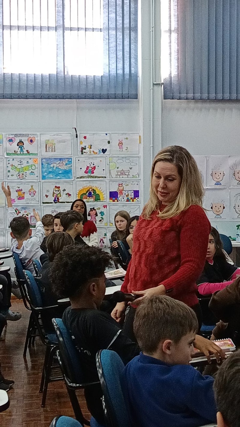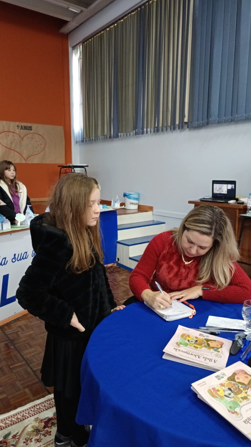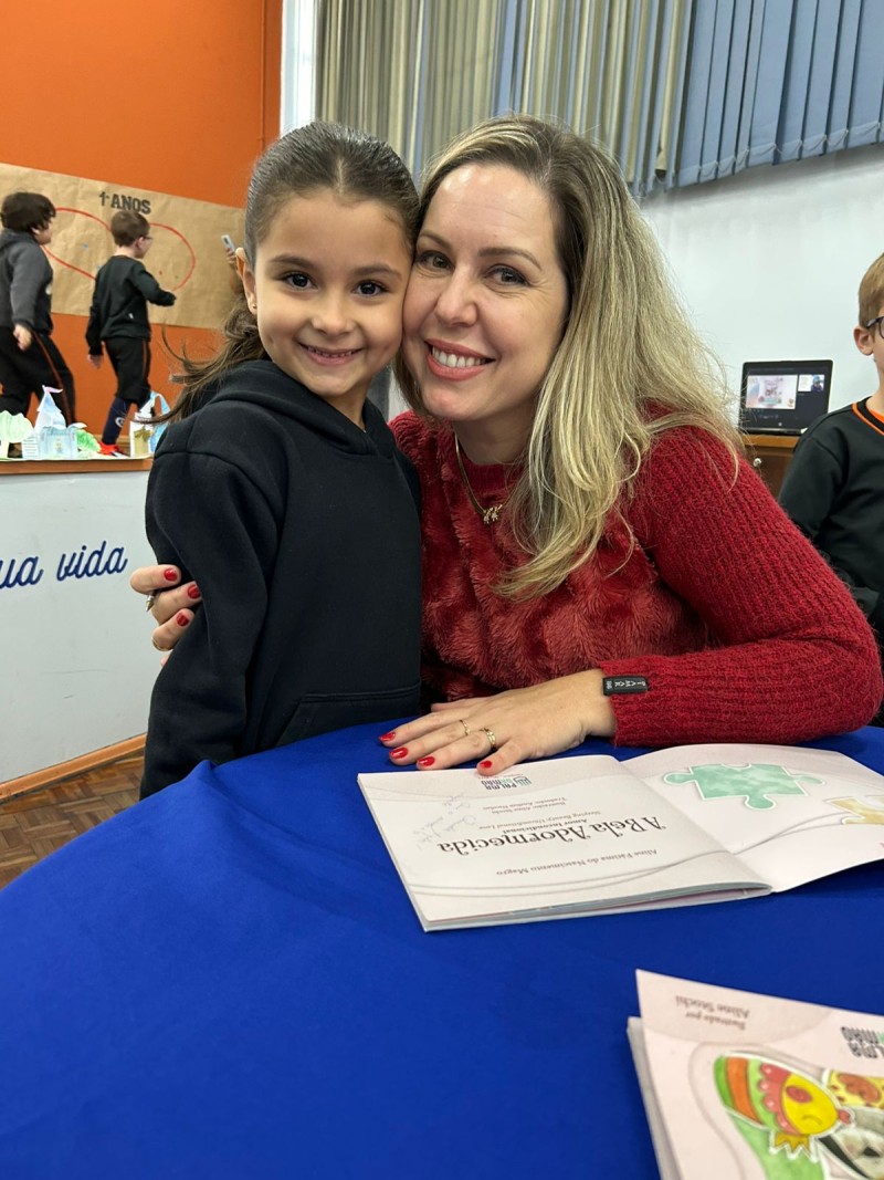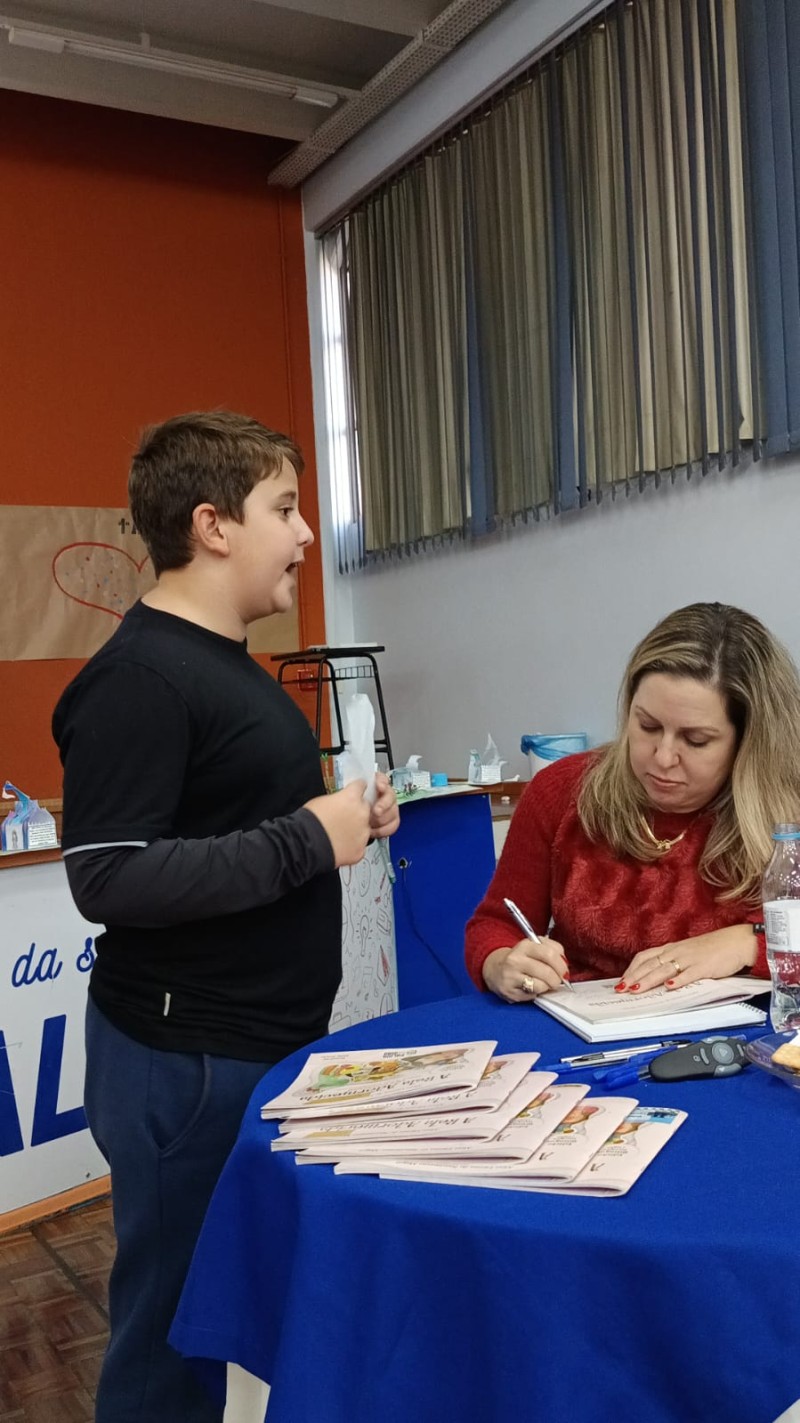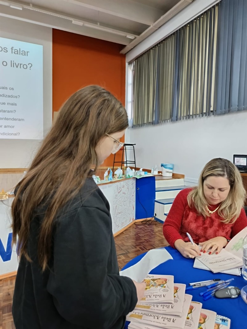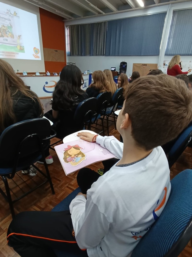 Em 13.06.25 ocorreu a 4ª fase do projeto da leitura. Sobre a obra A Bela Adormecida: Amor Incondicional (edição bilíngue – Português/Inglês), com a presença da autora Aline Fátima do Nascimento Magro. Natural de Santa Rosa/RS, ela reside em Chapecó/SC com a família há quinze anos, é servidora pública e doutora em Serviço Social. Aline transformou vivências e experiências da família numa obra de literatura infantil com viés do transtorno de espectro autista (TEA), fruto do aprendizado por meio do amor incondicional. A obra é literalmente o livro da sua vida e sempre terá um lugar especial no meu coração, pois teve inspiração na Natália, sua segunda filha, que foi diagnosticada com TEA aos três anos, sendo carregado por uma poderosa mensagem de amor que toca o coração de pequenos aos adultos. Fase essa que houve, abertura, acolhimento às professoras, crianças, e principalmente a escritora Aline, pela Coordenação Pedagógica Ivanir Lopes. Depois o diálogo da escritora com as crianças. Momento de autógrafos e para a fotografia da turma com a autora, e por fim, atividade dinâmica, onde cada criança deixou sua marca, representando que cada um é diferente, respeitando a diversidade, num coração cheio de digitais, e retomando o viés da obra, o amor incondicional!