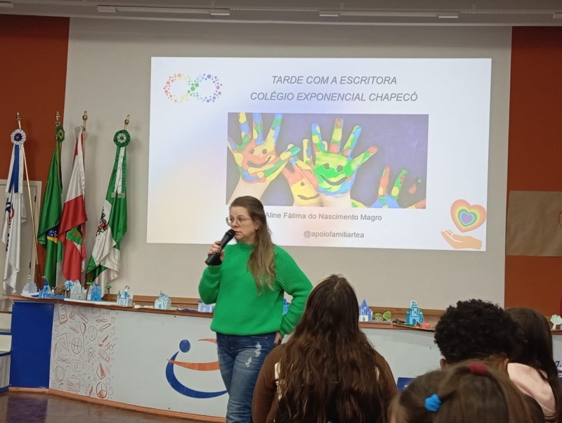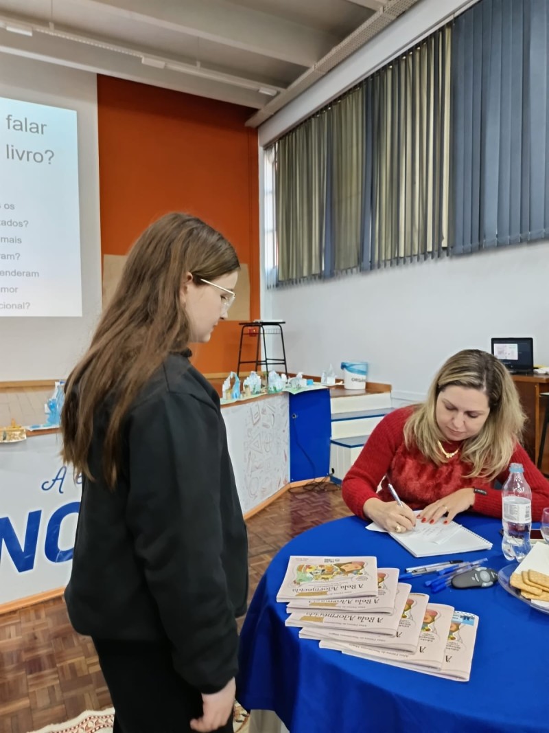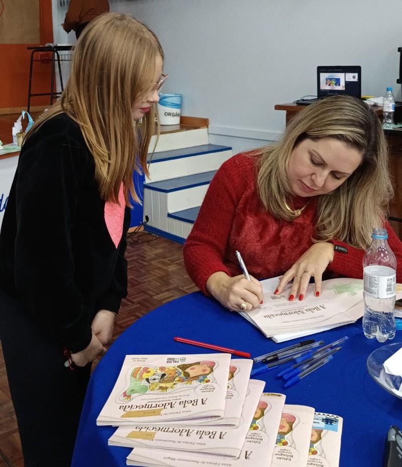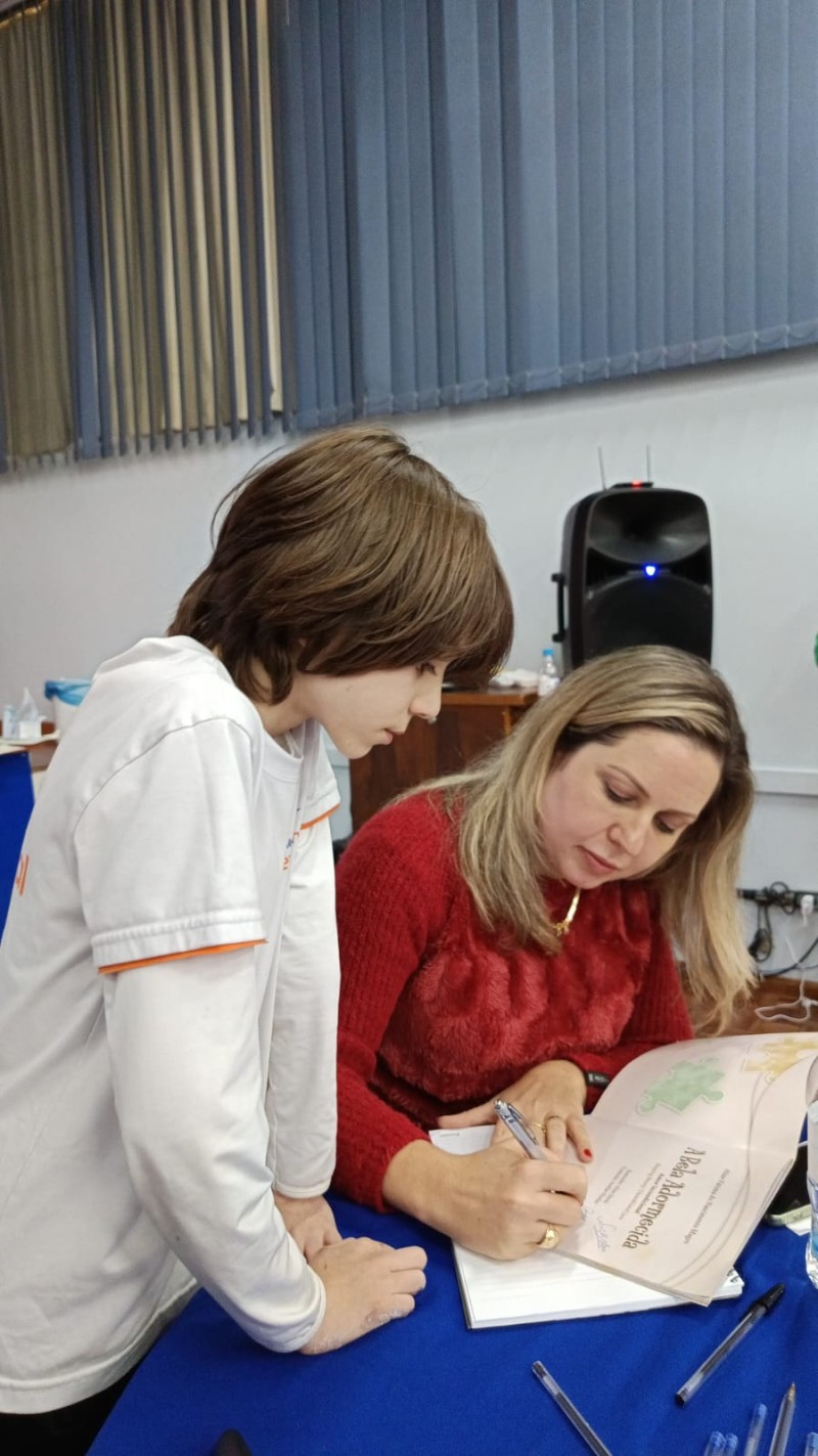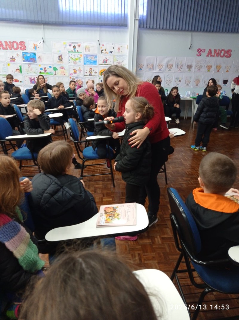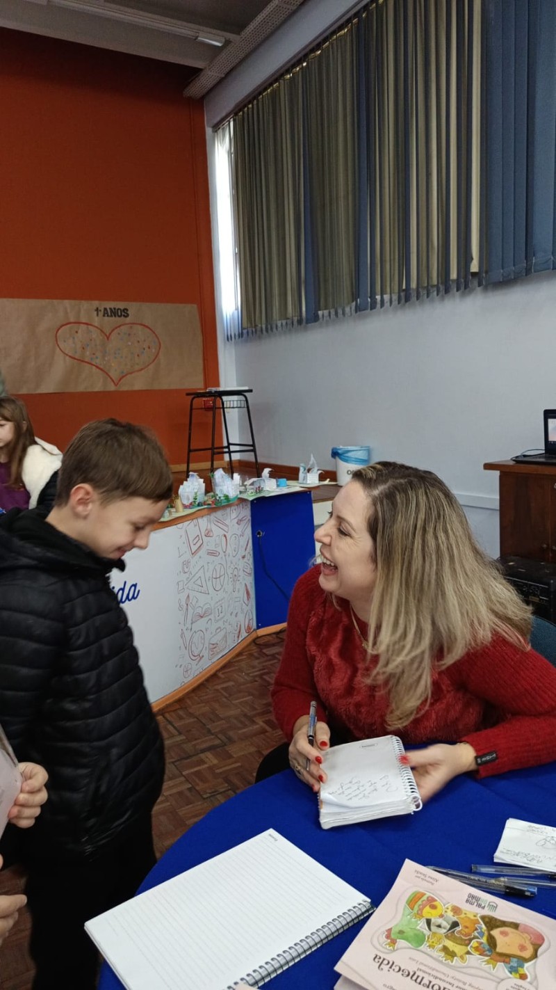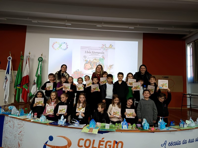 Em 13.06.25 ocorreu a 4ª fase do projeto da leitura. Sobre a obra A Bela Adormecida: Amor Incondicional (edição bilíngue – Português/Inglês), com a presença da autora Aline Fátima do Nascimento Magro. Natural de Santa Rosa/RS, ela reside em Chapecó/SC com a família há quinze anos, é servidora pública e doutora em Serviço Social. Aline transformou vivências e experiências da família numa obra de literatura infantil com viés do transtorno de espectro autista (TEA), fruto do aprendizado por meio do amor incondicional. A obra é literalmente o livro da sua vida e sempre terá um lugar especial no meu coração, pois teve inspiração na Natália, sua segunda filha, que foi diagnosticada com TEA aos três anos, sendo carregado por uma poderosa mensagem de amor que toca o coração de pequenos aos adultos. Fase essa que houve, abertura, acolhimento às professoras, crianças, e principalmente a escritora Aline, pela Coordenação Pedagógica Ivanir Lopes. Depois o diálogo da escritora com as crianças. Momento de autógrafos e para a fotografia da turma com a autora, e por fim, atividade dinâmica, onde cada criança deixou sua marca, representando que cada um é diferente, respeitando a diversidade, num coração cheio de digitais, e retomando o viés da obra, o amor incondicional!