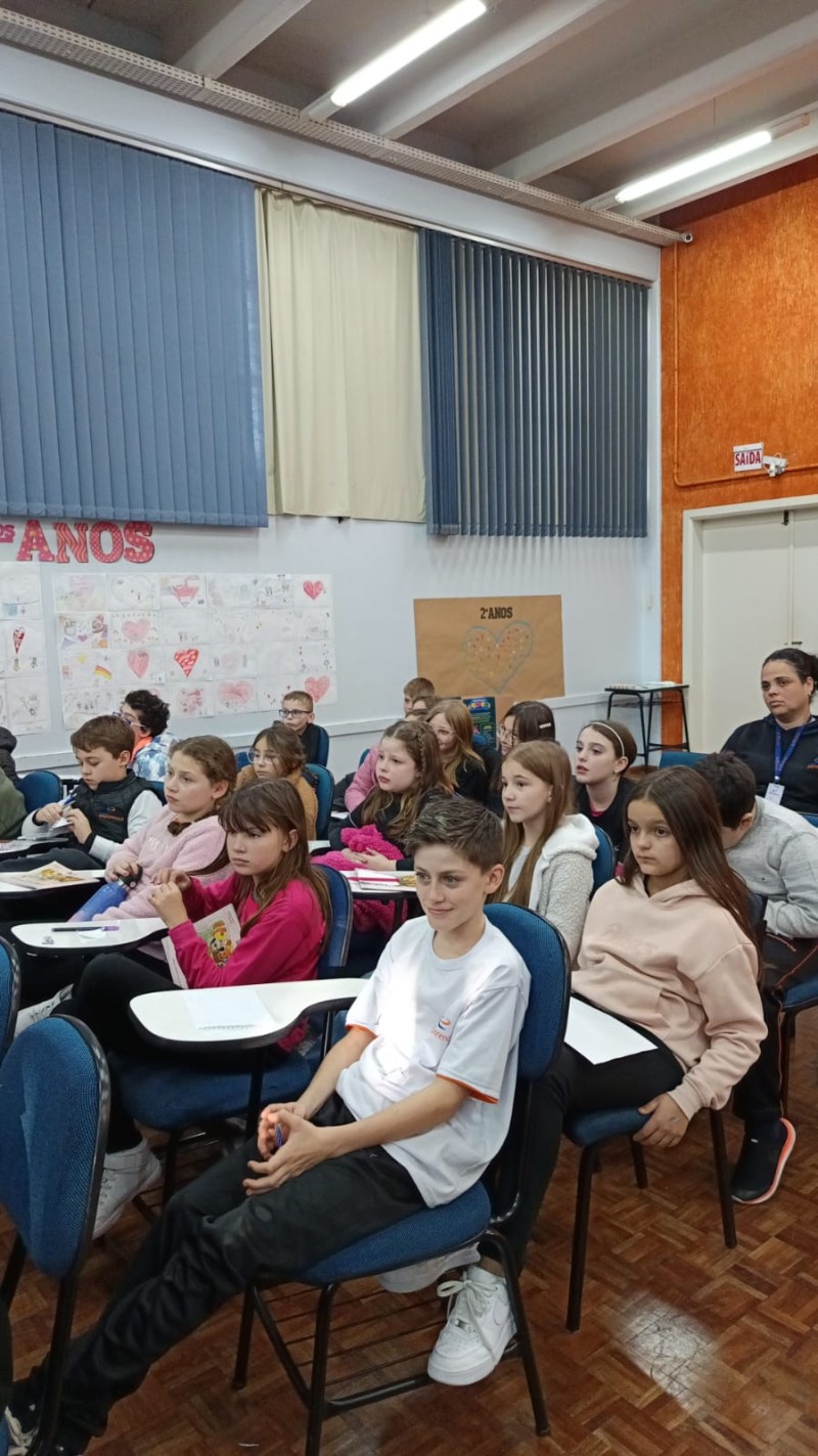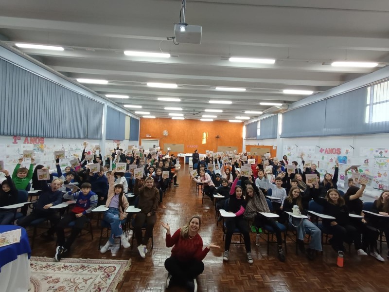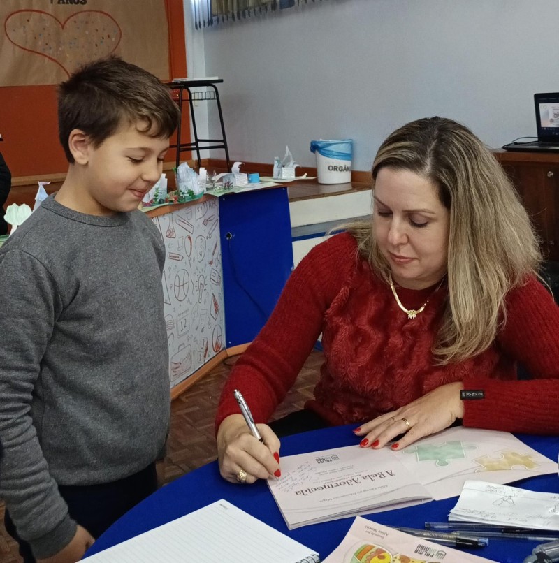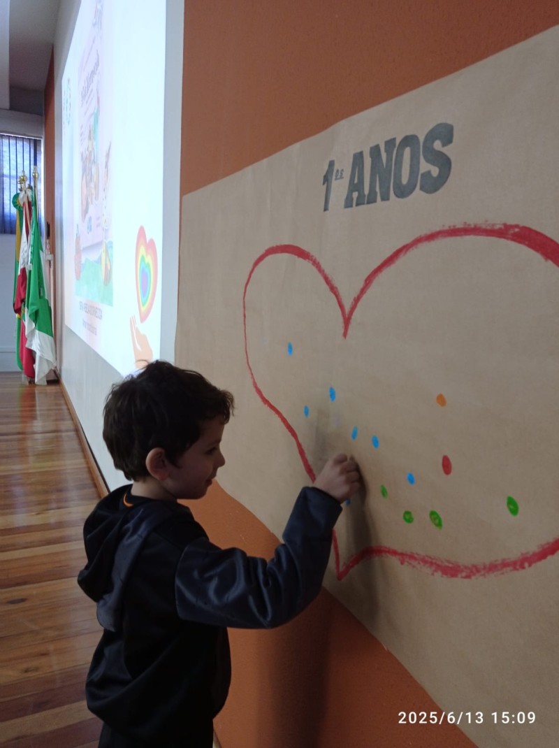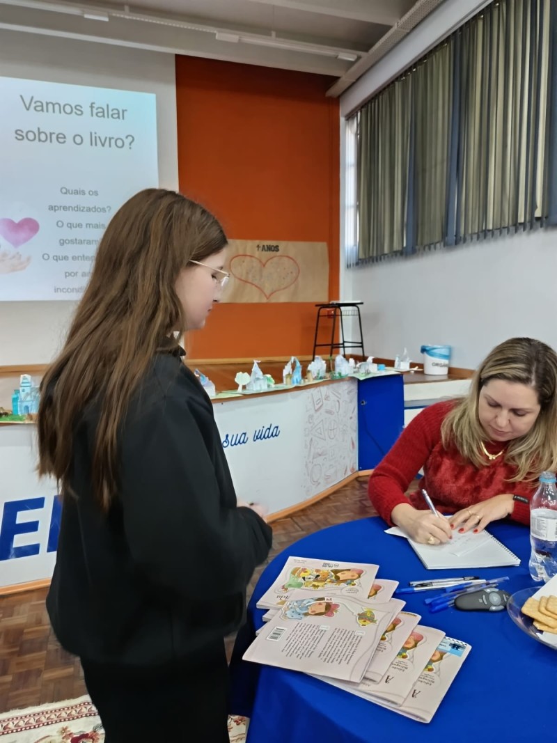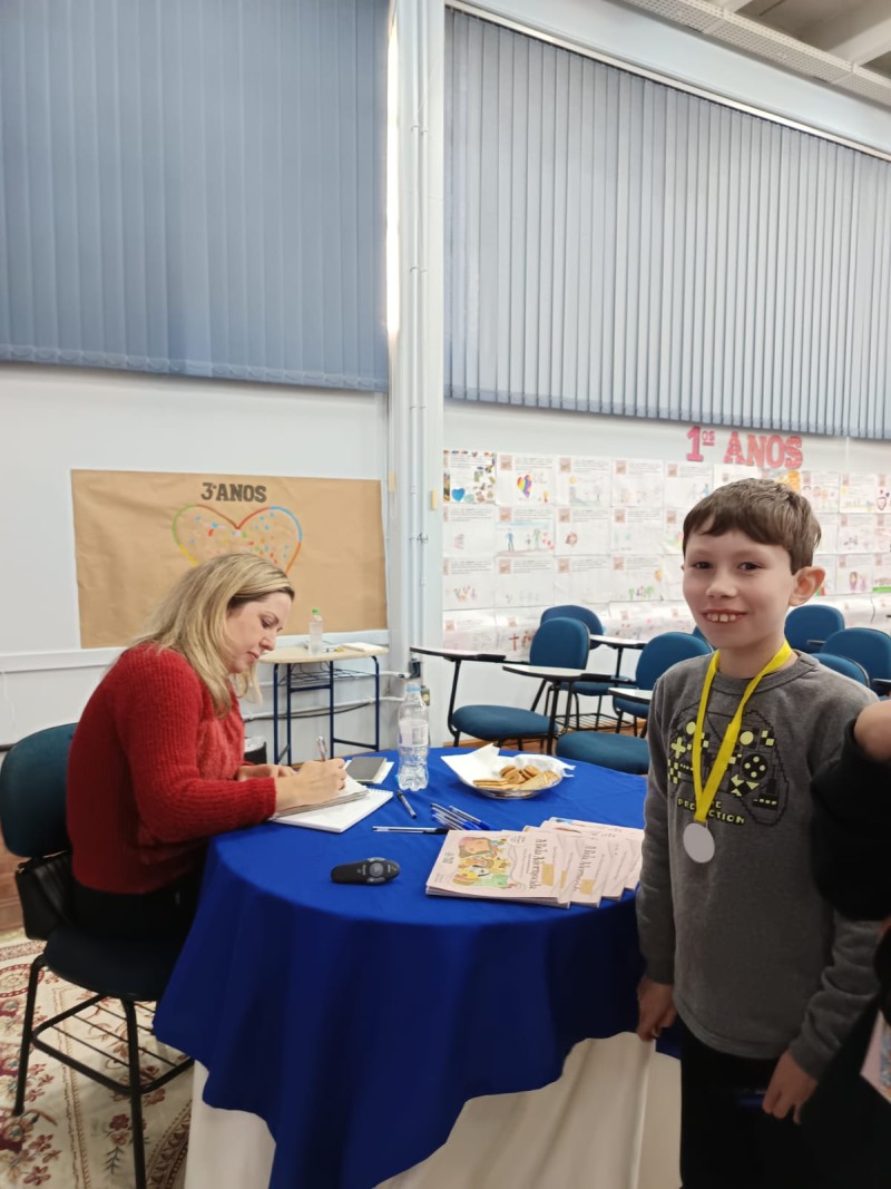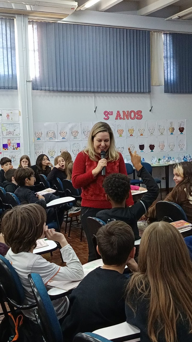 Em 13.06.25 ocorreu a 4ª fase do projeto da leitura. Sobre a obra A Bela Adormecida: Amor Incondicional (edição bilíngue – Português/Inglês), com a presença da autora Aline Fátima do Nascimento Magro. Natural de Santa Rosa/RS, ela reside em Chapecó/SC com a família há quinze anos, é servidora pública e doutora em Serviço Social. Aline transformou vivências e experiências da família numa obra de literatura infantil com viés do transtorno de espectro autista (TEA), fruto do aprendizado por meio do amor incondicional. A obra é literalmente o livro da sua vida e sempre terá um lugar especial no meu coração, pois teve inspiração na Natália, sua segunda filha, que foi diagnosticada com TEA aos três anos, sendo carregado por uma poderosa mensagem de amor que toca o coração de pequenos aos adultos. Fase essa que houve, abertura, acolhimento às professoras, crianças, e principalmente a escritora Aline, pela Coordenação Pedagógica Ivanir Lopes. Depois o diálogo da escritora com as crianças. Momento de autógrafos e para a fotografia da turma com a autora, e por fim, atividade dinâmica, onde cada criança deixou sua marca, representando que cada um é diferente, respeitando a diversidade, num coração cheio de digitais, e retomando o viés da obra, o amor incondicional!