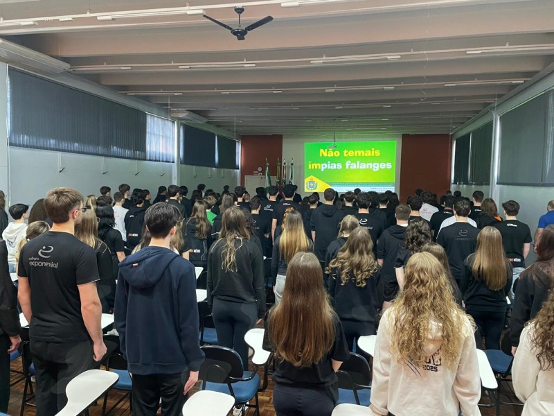 Os estudantes do Ensino Médio participaram da abertura da Semana da Pátria, nesta segunda-feira, 1º de setembro de 2025. Um momento especial de reflexão sobre os valores de cidadania, respeito e amor ao nosso País, coordenado pelo professor de História André Lorenzoni. Mais do que uma tradição, a Semana da Pátria é uma oportunidade para reforçar a importância da participação dos jovens na construção de um futuro melhor.